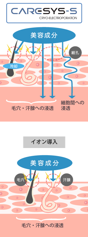 エレクトロポレーションに加えケアシス-Sでは、冷/温の調整をしつつ導入できるクライオ技術(45℃からー20℃まで調節可能)を組み合わせて、高濃度の美容成分を大量に皮膚深層まで浸透させます。